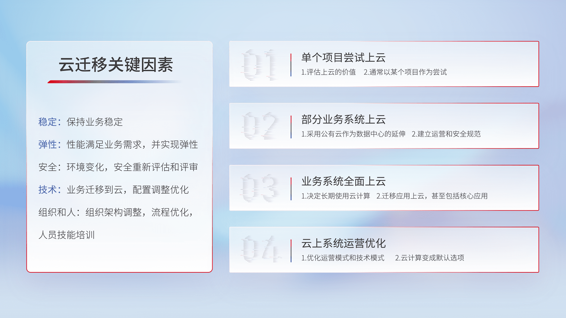 结合实际业务,,,从规划设计、、云平台选型、、、、云原生改造、、数据迁移、、、集成交付,,迁移全过程为客户识别最佳上云路径,,,,做好风险识别管理,,,设计网络架构、、身份权限、、安全审计合规、、、操作审计、、日志审计、、、、监控告警策略、、多站点容灾设计等,,,对云上基础设施进行整体规划,,,提升IT治理水平,,,以满足弹性、、、高可用、、、、高性能的需求。。