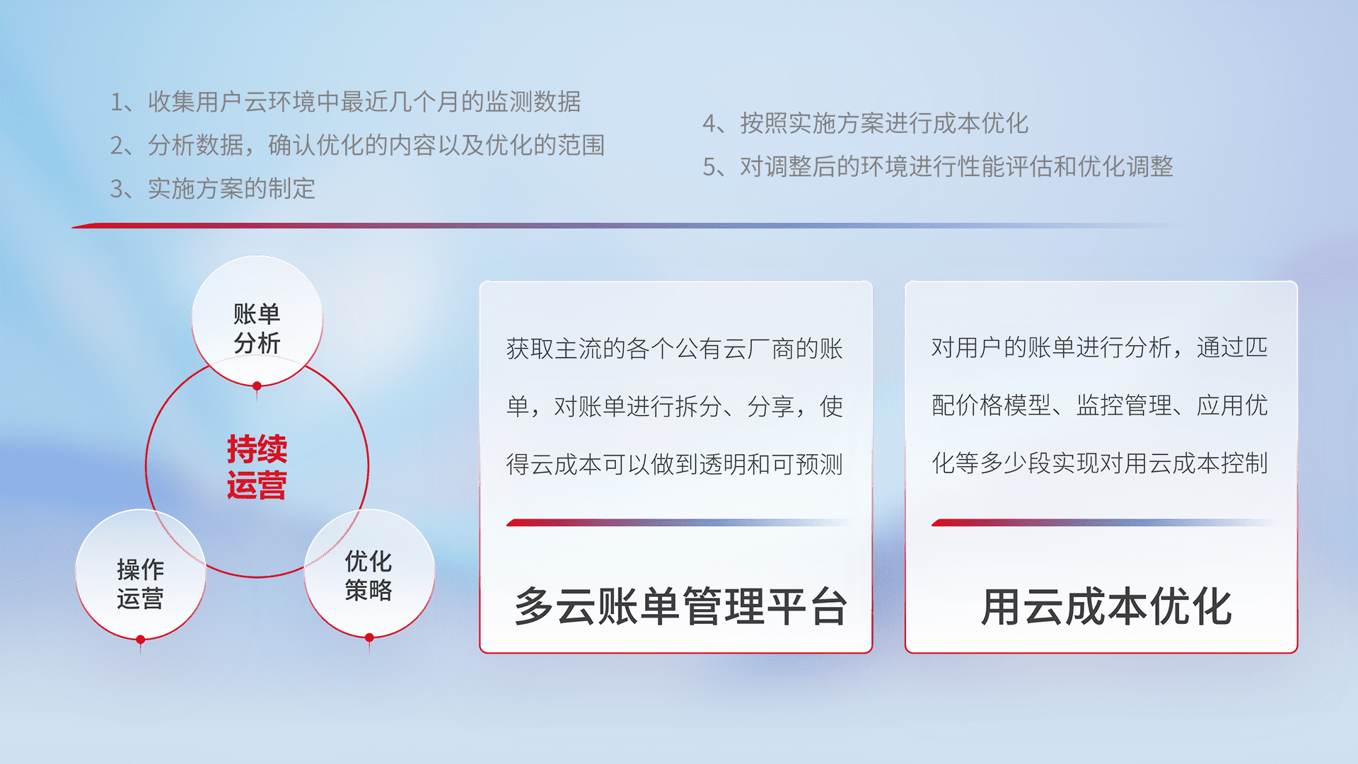 通过多云纳管,,以统一的资源数据模型把客户的云资源进行抽象和封装,,,进而实现对多云资源的统一操作,,,保障云资源管理的可靠性、、、、稳定性与可用性。。。量身定制化运维内容,,,配置、、、、开发运维、、补丁管理、、备份、、、监控、、、、认证和访问管理、、、审计和日常巡检等,,,,保障在用云过程中的可靠度,,,稳定度以及高可用率。。